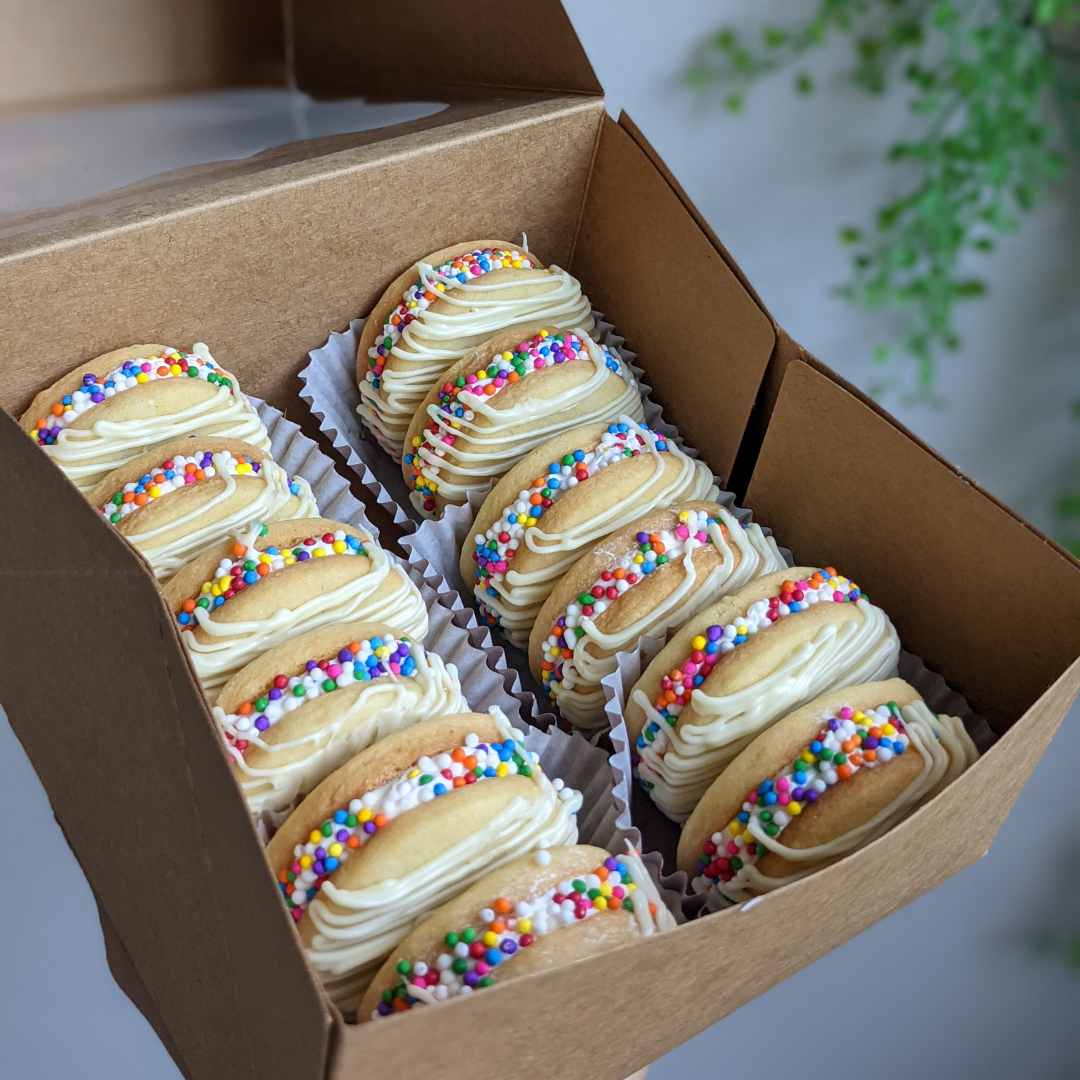 Our Birthday alfajores are the perfect fun treat for your party guests. They are filled with vanilla buttercream and a fruity center (which can change depending on availability) covered with rainbow sprinkles and white chocolate drizzle.