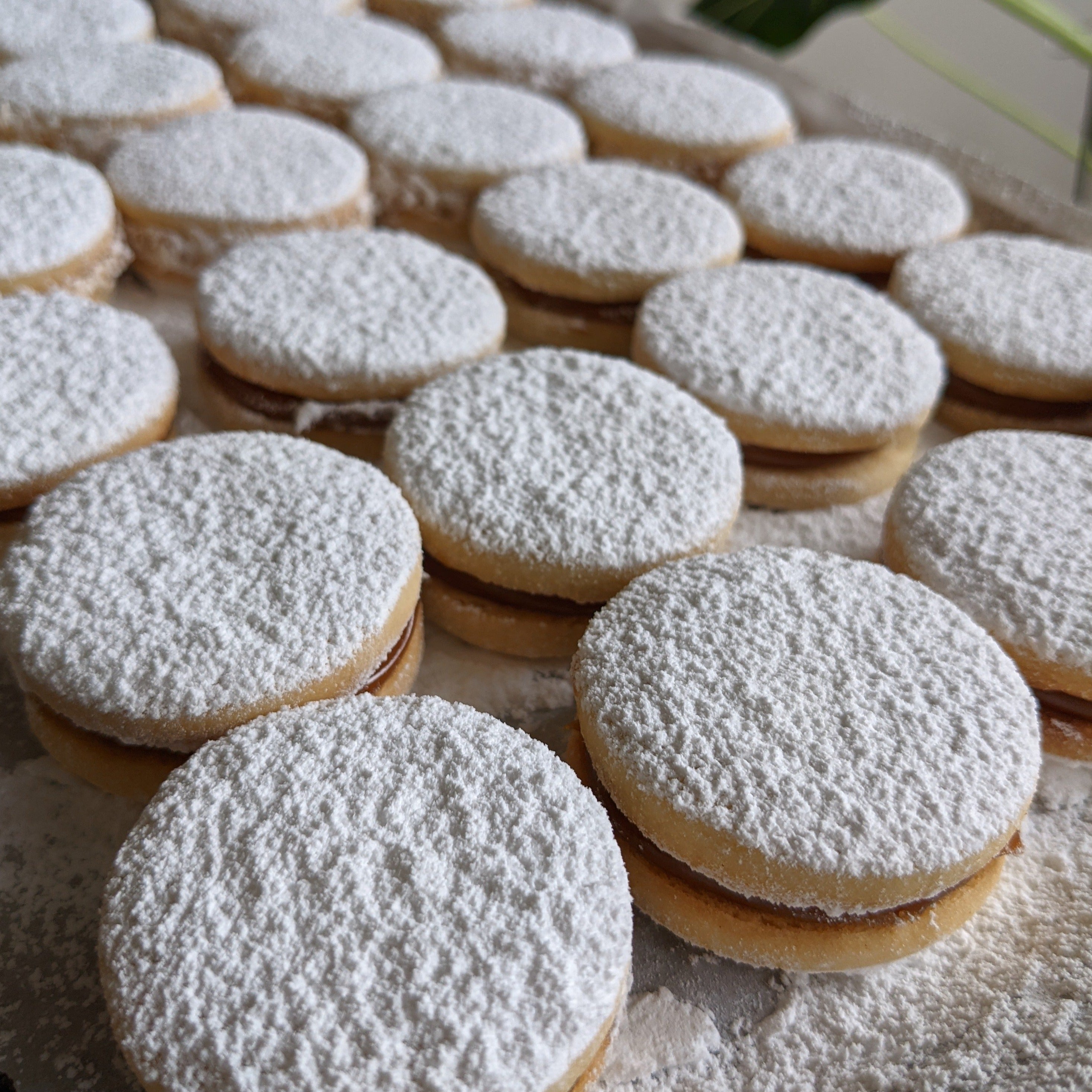 These sandwich cookies are filled with Dulce de leche (milk-based thick cream) and dusted with icing sugar. They melt in your mount, try them, and you will understand why we love them sooo much!