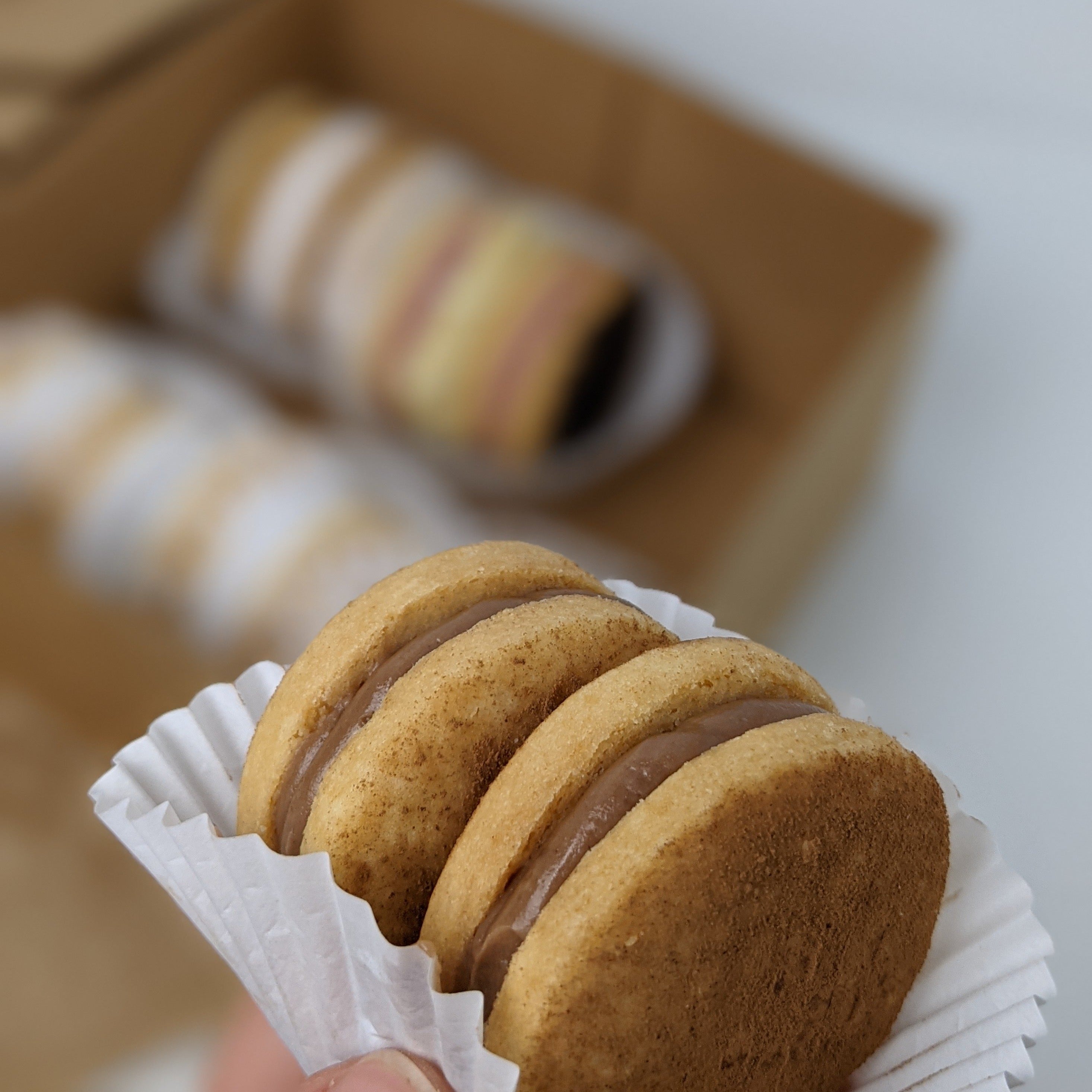 Our buttery sandwiches are filled with Nutella buttercream and a center of pure Nutella for that extra Nutella hit in every bite and dusted with a very thin coat of cocoa powder.