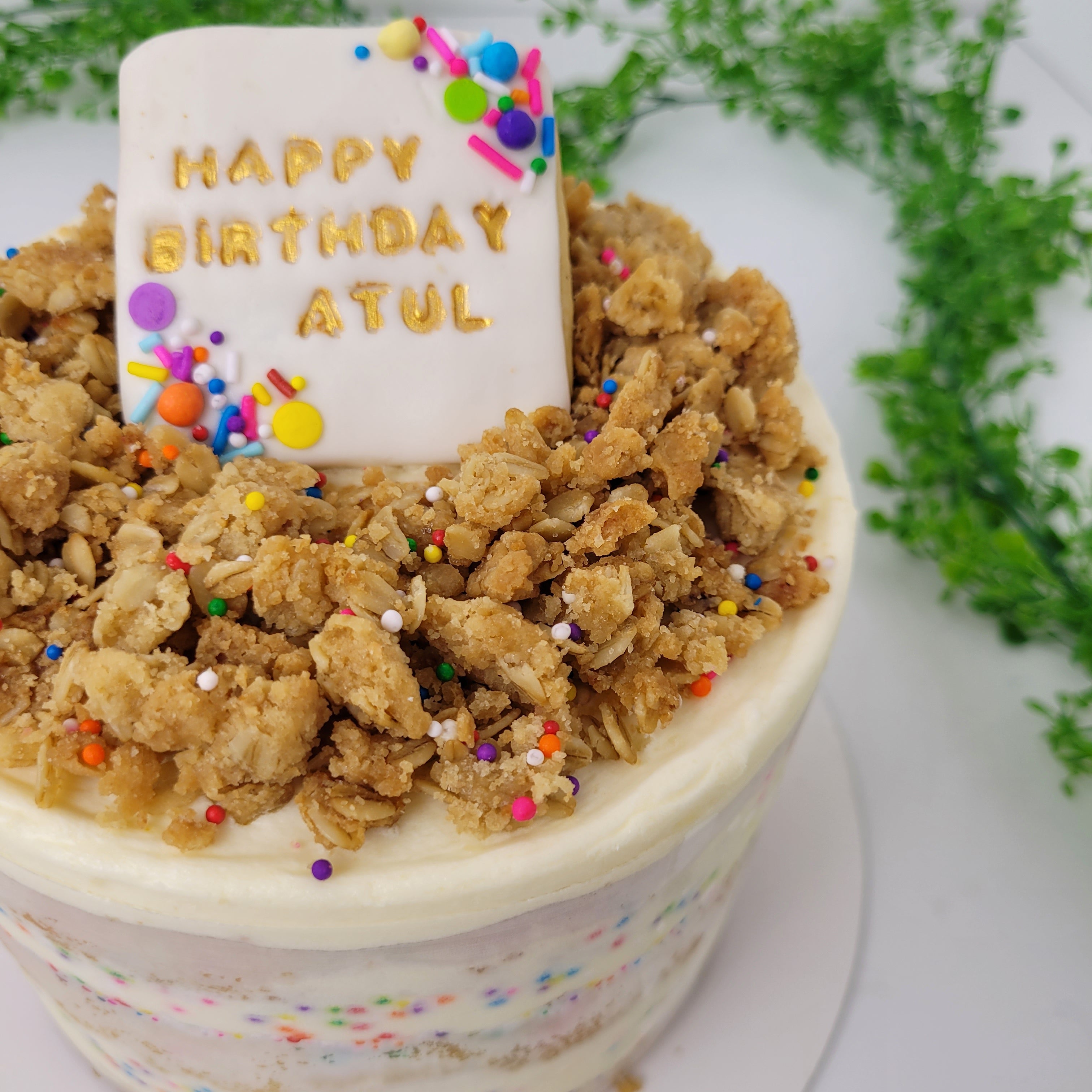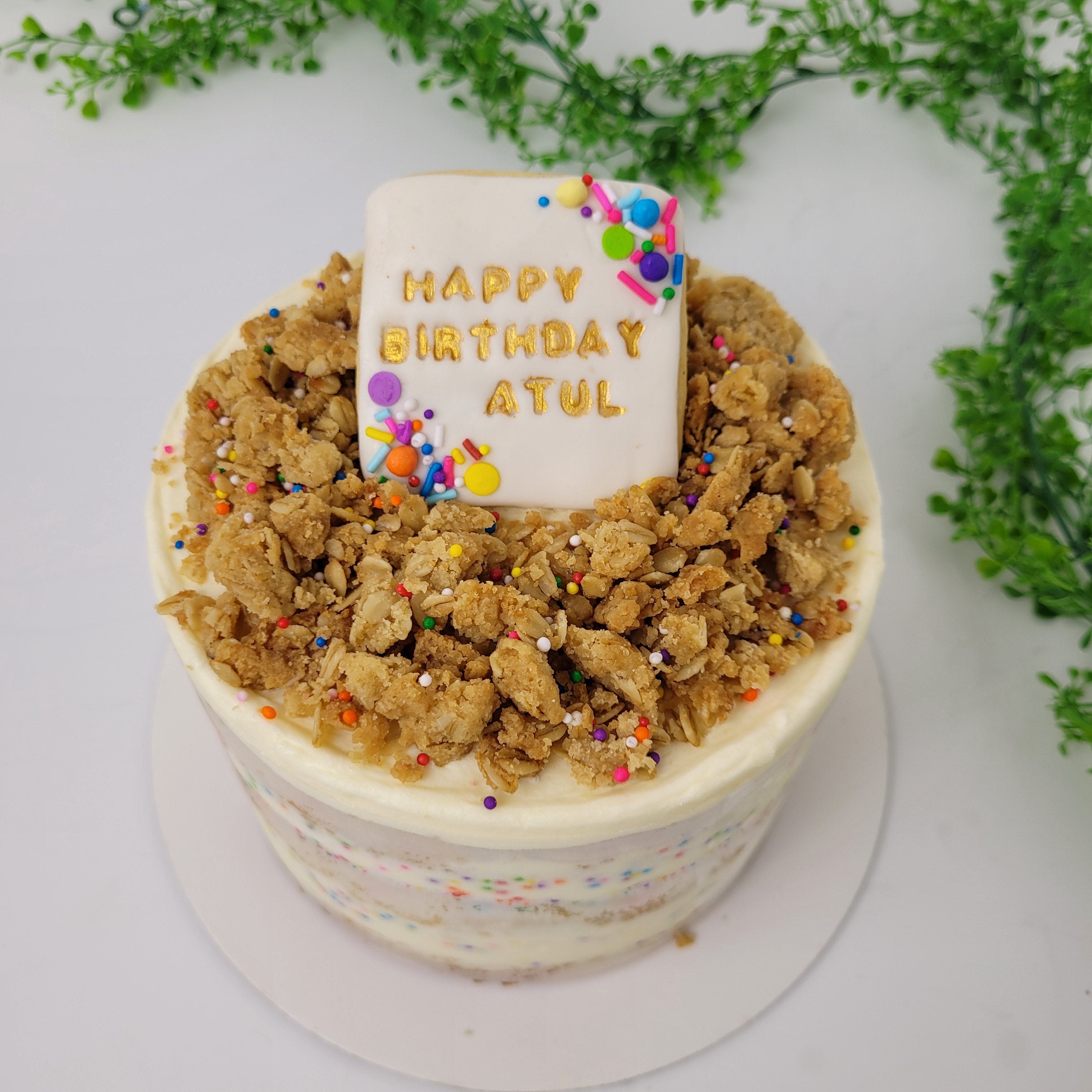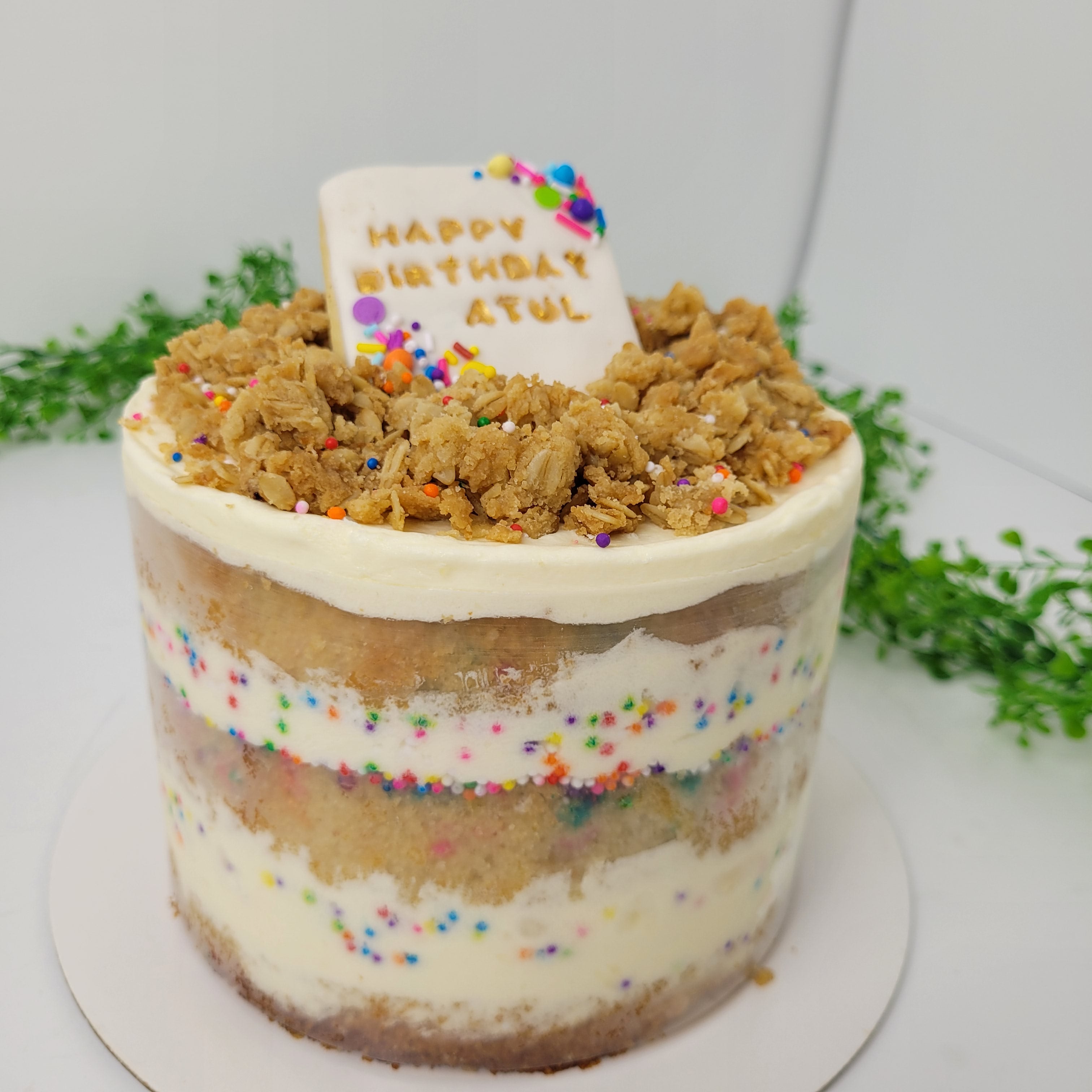 Our moist funfetti vanilla cake is filled with Cream Cheese Frosting, covered with a buttery and crispy oats crumble and topped with a cookie for a customized message.