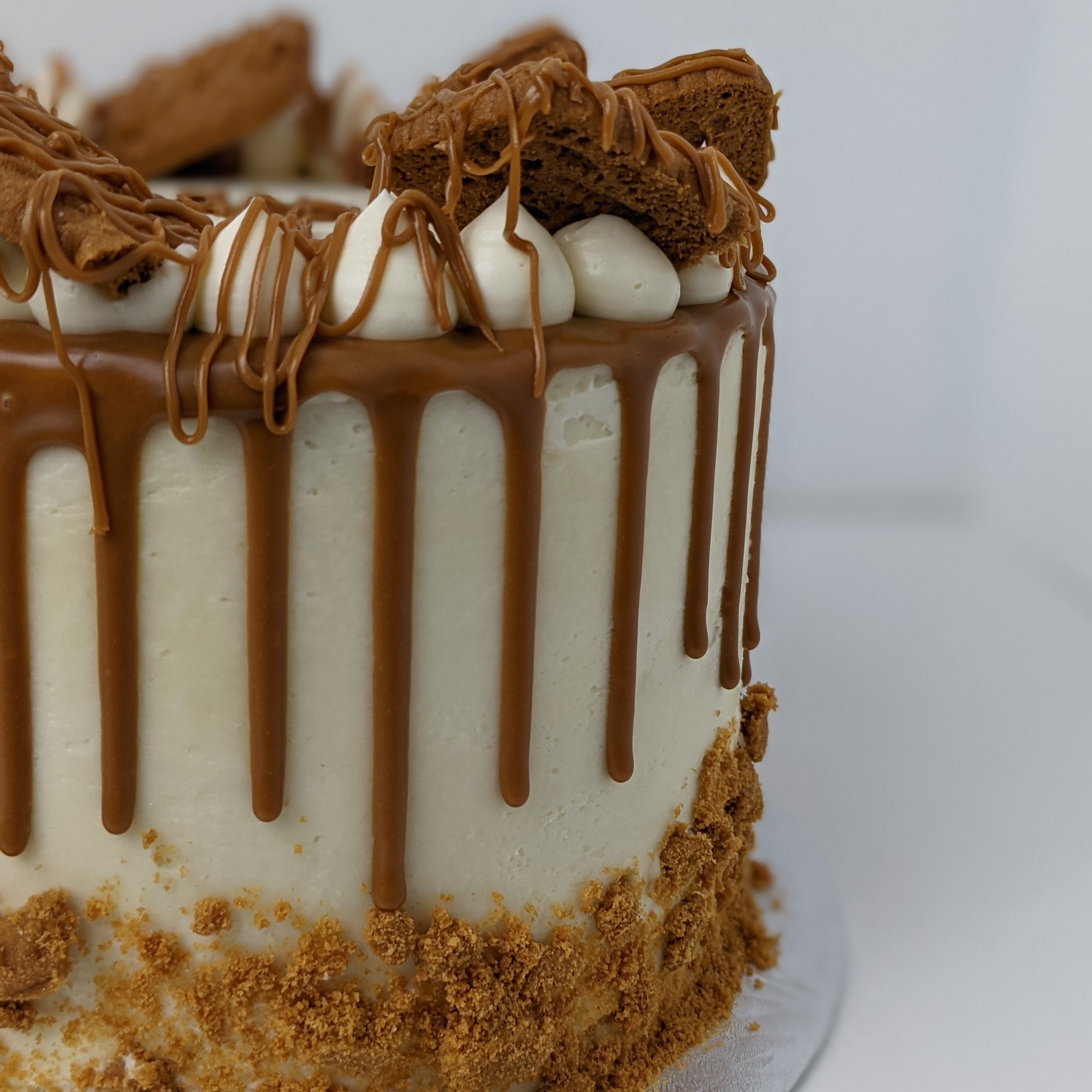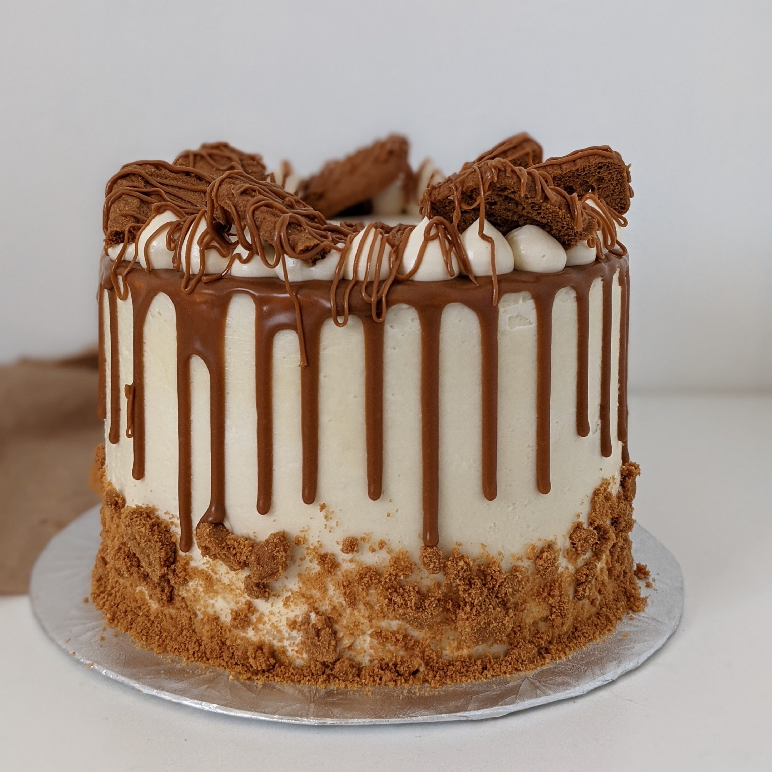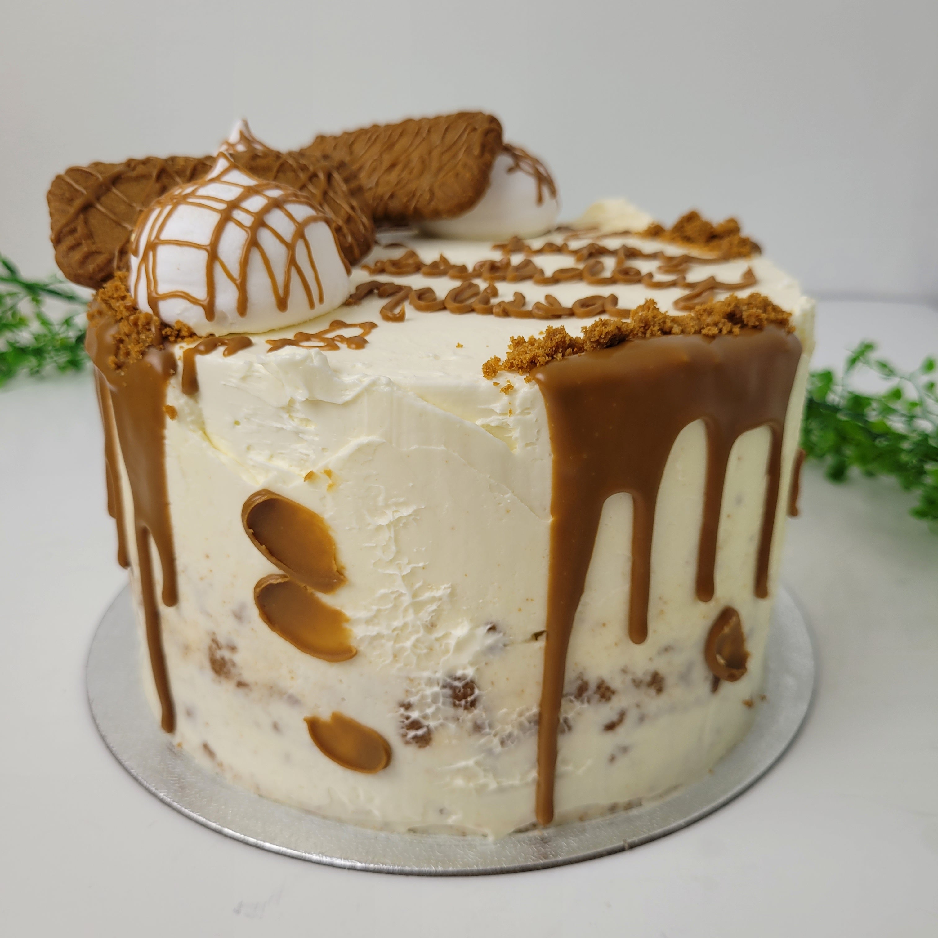Our moist vanilla cake with Lotus cookies filled with Dulce de leche and Lotus spread covered with our vanilla Swiss buttercream, a drip of Lotus Spread and more Lotus cookies.