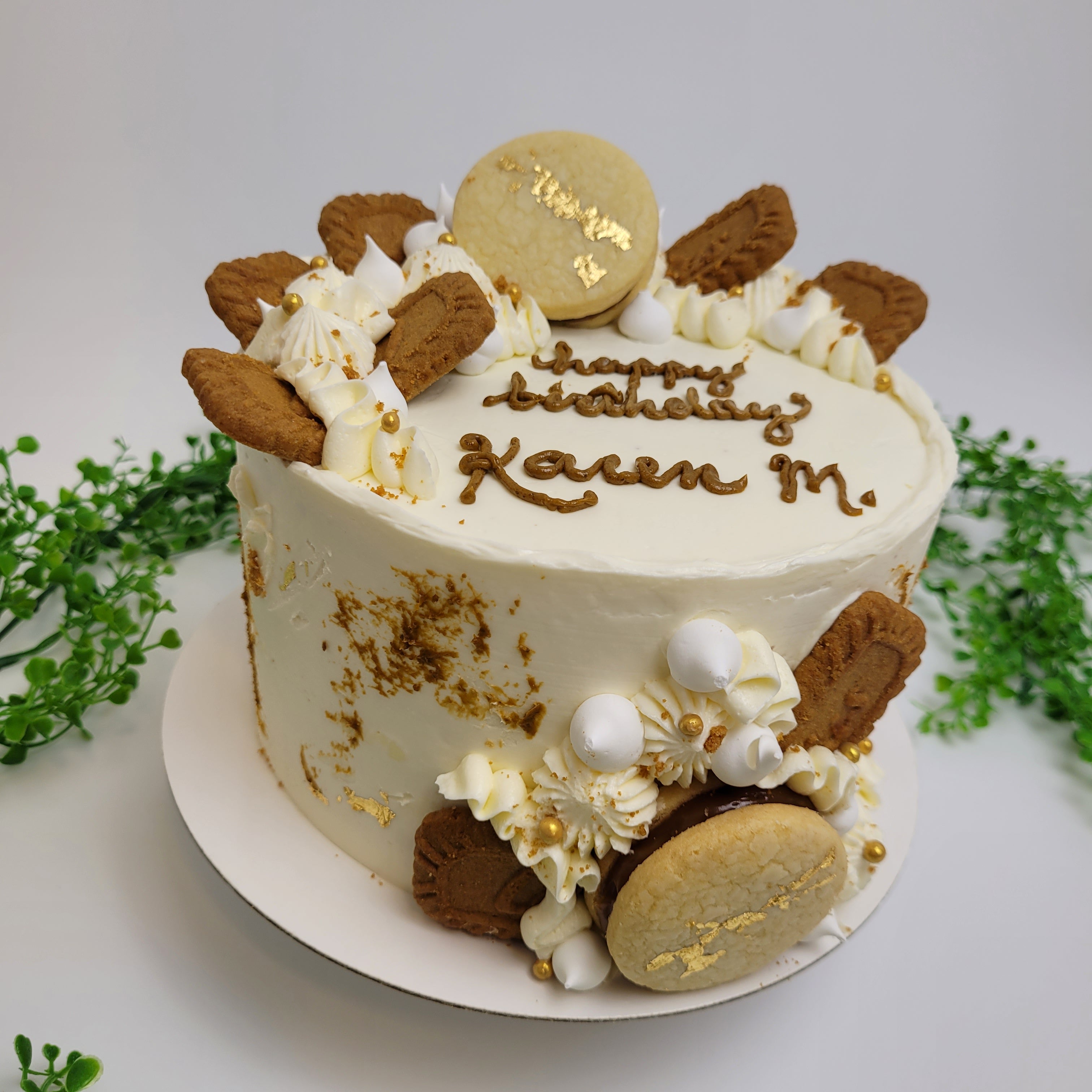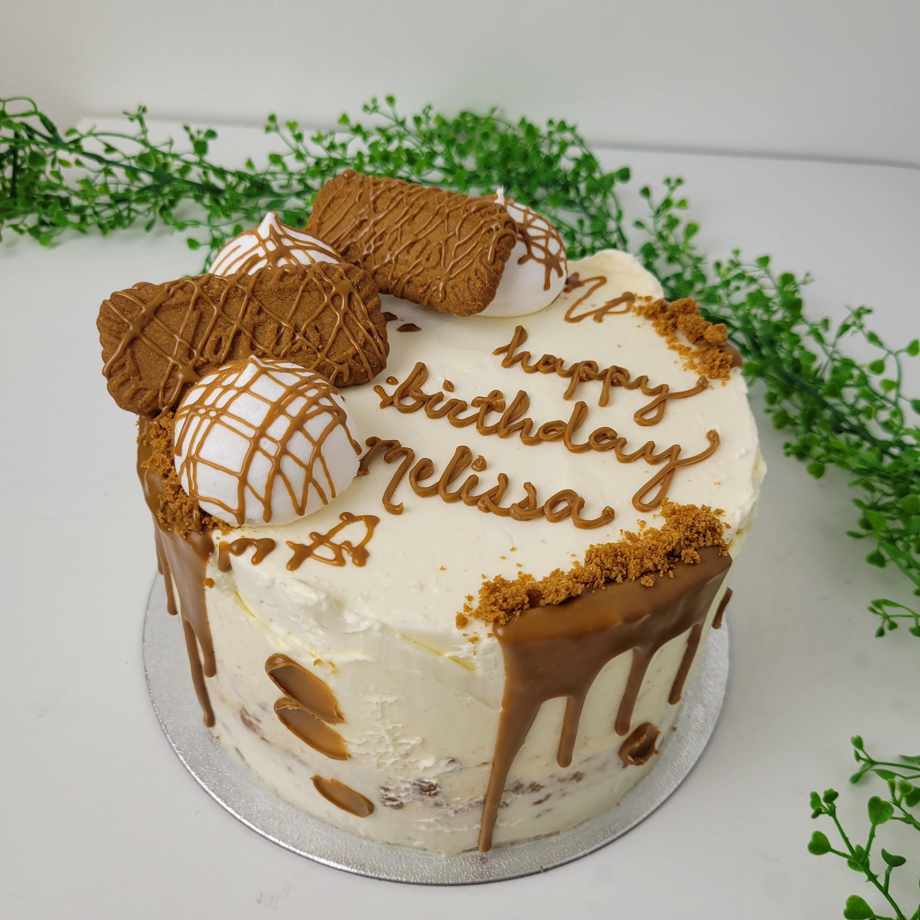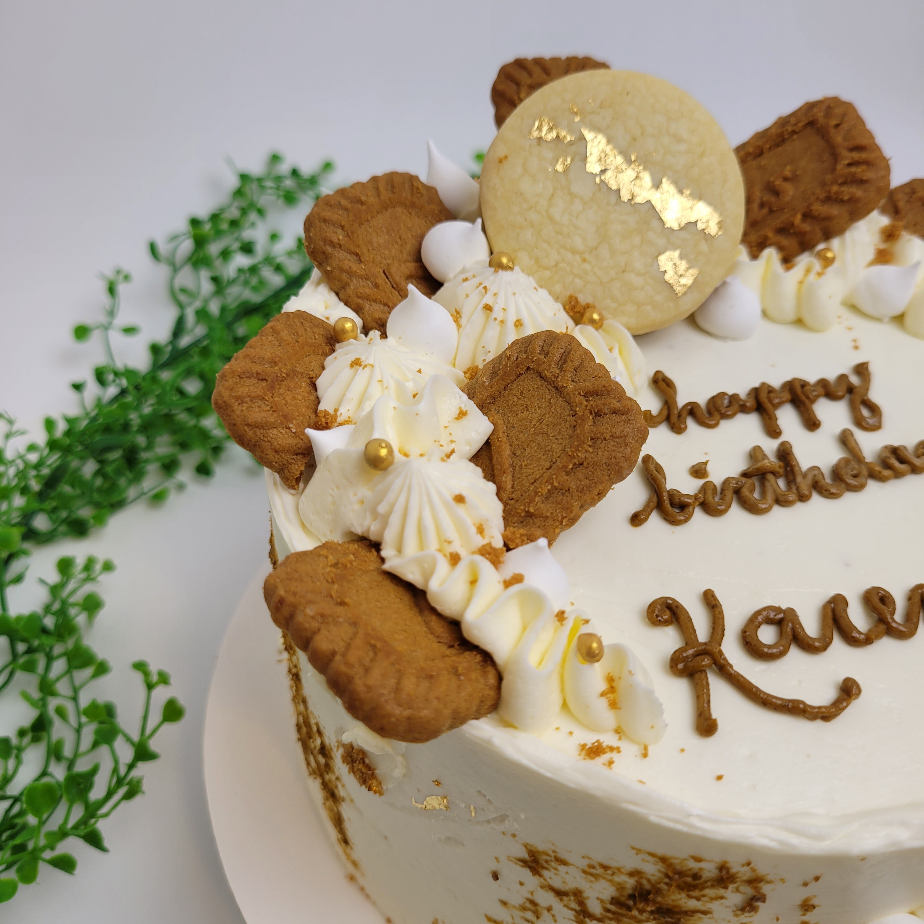 Our moist vanilla cake with Lotus cookies filled with Dulce de leche and Lotus spread covered with our vanilla Swiss buttercream, a drip of Lotus Spread and more Lotus cookies.